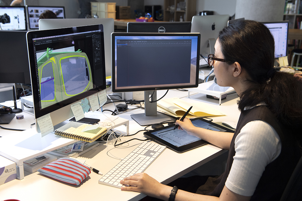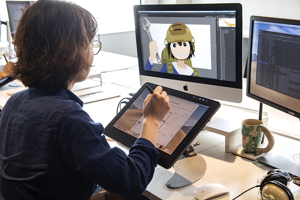 高畑氏【左】と太田氏【右】の作業風景。長机に各人のPCが配置されたシンプルなもの。同フロアのスタッフはほとんどiMac(macOS:Mojave 10.14)と、DELL製のサブモニタを接続したデュアルモニタ環境が整えられている。ペンタブレットはスタッフが使いやすいものを選んでいるが、インタビュイー3人は共にWacom Cintiq Pro 16を使用しているとのこと。ソフトはAnimate CC、Photoshop、CLIP STUDIO PAINTが基本となる