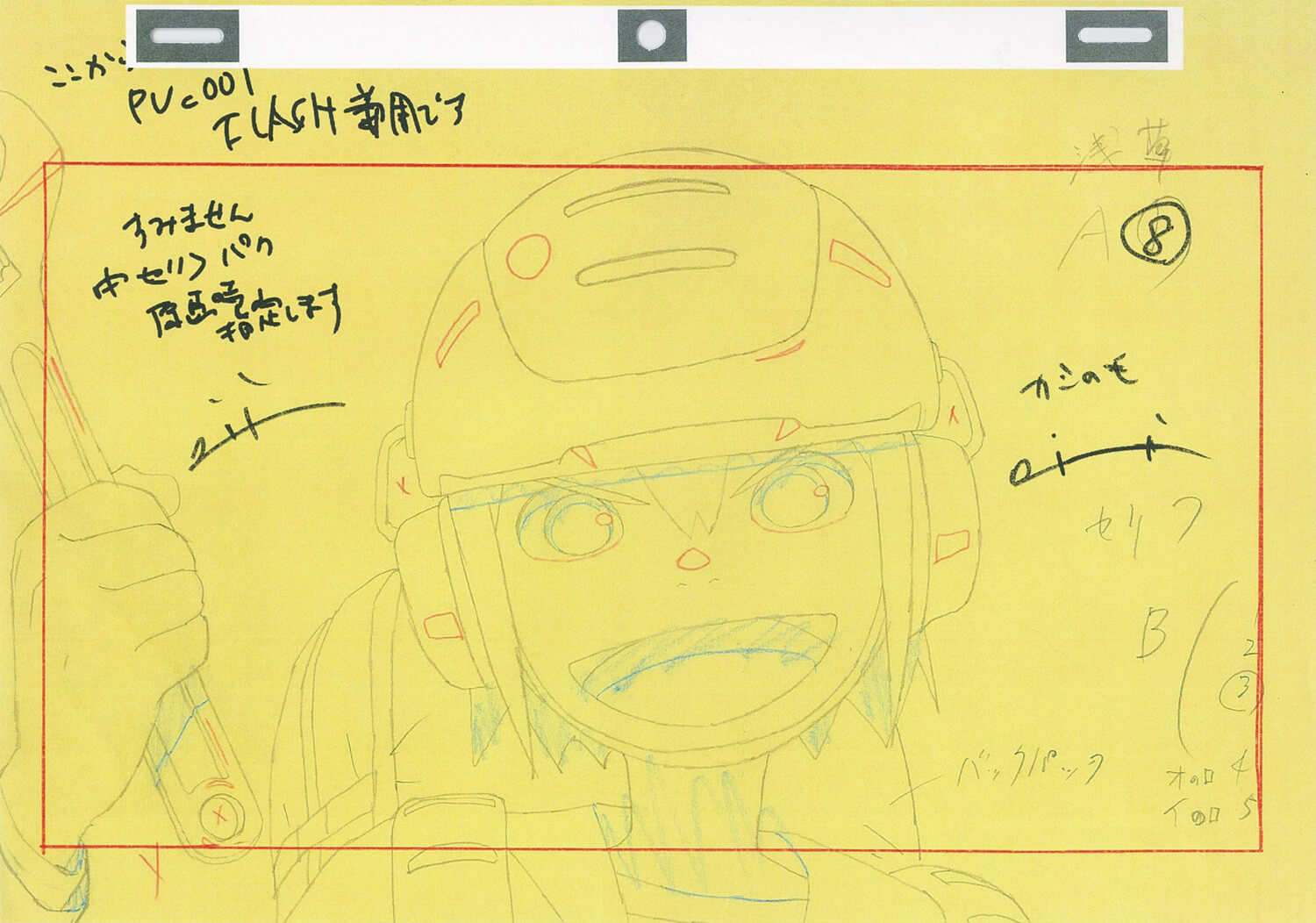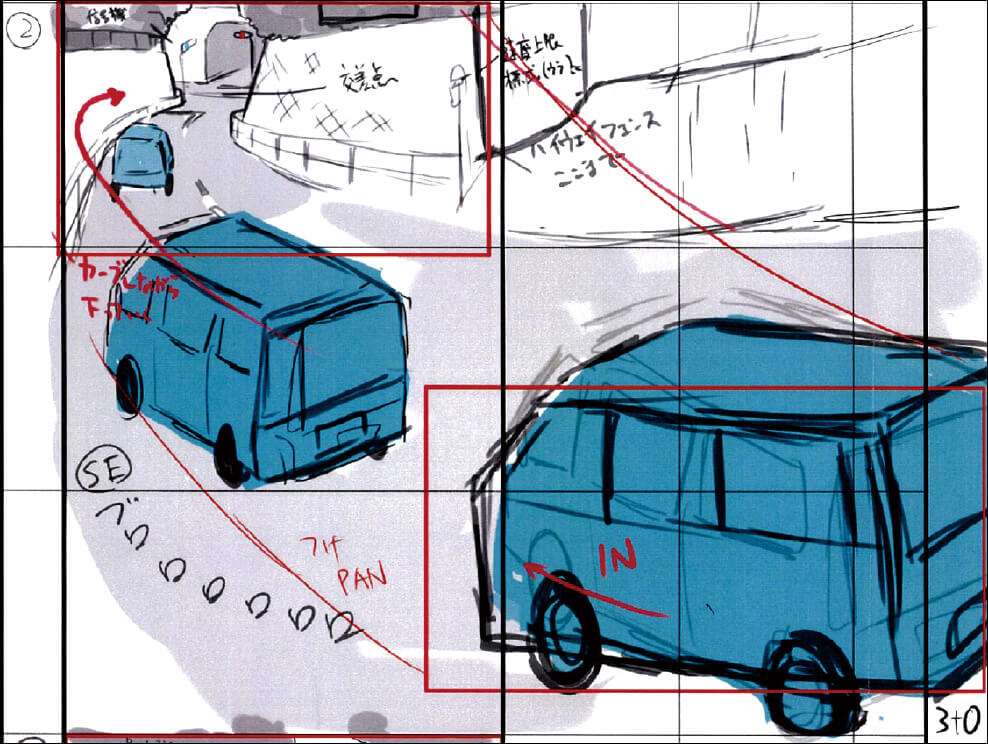 カット制作の過程を紹介する。▲絵コンテやレイアウト・原画では担当スタッフに合わせて紙とデータを使い分けている。この絵コンテを基に原画工程へと移る