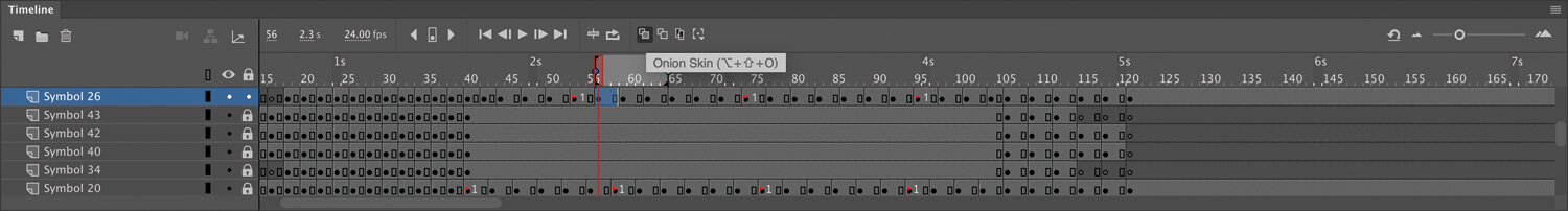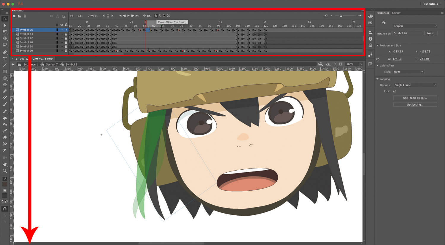 Animateの作業画面【上】とタイムラインのアップ【下】。タイムライン上で範囲を指定することで、その範囲のフレームを重ねて表示でき、その前後のアニメーションの軌道が可視化され、滑らかな動きが付けやすい。画像は髪の毛のアニメーション作業。自動中割では直線的な動きになってしまうところを、手作業で滑らかに動かしていく。海外のAnimateの作業では、髪の毛を一房ずつ分けて動かすという使い方は滅多にしないという。「このような複雑なデザインでAnimateを使うと言ったら、海外のアニメーターに"クレイジー"と言われると思います。Animateでここまで細かく調整するのは日本ならではだと思います」と本橋氏は笑う。クレイジーだからこそ、サイエンスSARUでしか表現できない世界が生まれるのだ
