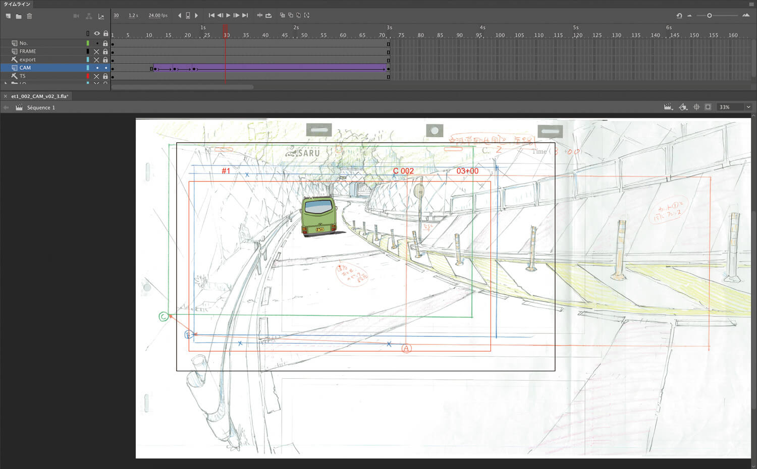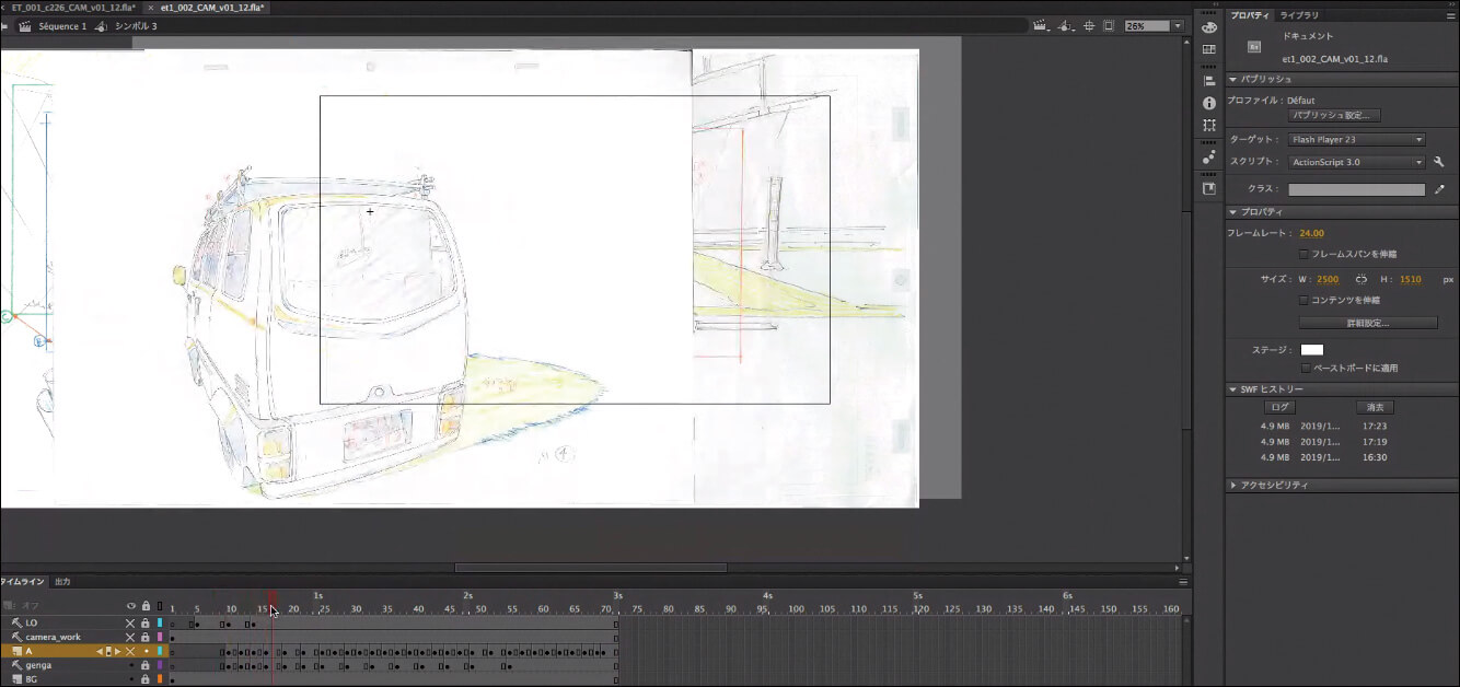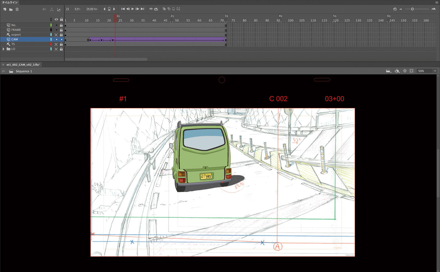 ▲レイアウト。このカットの原画スタッフは手描きのため、スキャンして取り込み、データ化する。Animateのタイムラインで素材が動かせるか確認を行い、今回のカットでは連番の原画に合わせて走るクルマを描いていく。カメラは最終的にAfter Effects上で付けるが、Animate上でも仮のカメラワークを付けながらカット作業を行うという