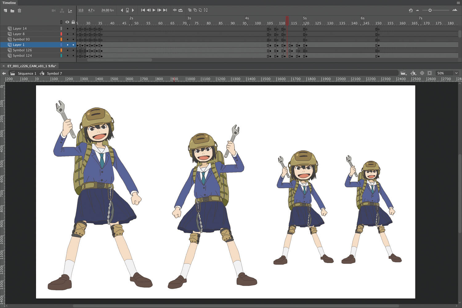 ▲素材ごとに指定して動かすことがきるというデジタルツールの長所を活かすことで、キャラクターのバリエーションの作成も容易だという。カットを通してのキャラクターサイズの変更や反転はもちろん、黒目の素材だけを移動させて目線を修正することも、ポジションの移動も自由に行える。左の画像はサイズ変更したキャラクター比較の例。単純に全体サイズの拡大縮小ではなく、箇所ごとに素材を動かせるため、プロポーション調整も可能だ