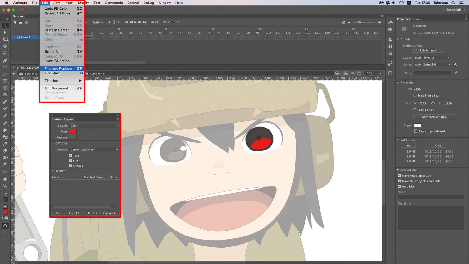 ▲色変え作業画面&各ウインドウのアップ。まず色変えを行う箇所のレイヤーを指定し、色を選択する。(コマンド+F)[Edit]→[Find &Replace]で、[Find]欄に置き換えたい色を選択し、[Replace]欄に置き換え後の色を選択→[Replace All]で置き換えは完了だ。全てのフレームを一括で変えることができる。アニメ制作の現場では、初期の段階では色が決まっていないことが多い。そこで、まず仮色で色分けしつつ、素材づくりやアニメーション作業を進め、その間に仮色状態のスクリーンショット(png)を参考に、色指定作業が進められる。最終的に大量の色変えが発生するが、この「色変換」機能により、その手間が大幅に削減されるのだ