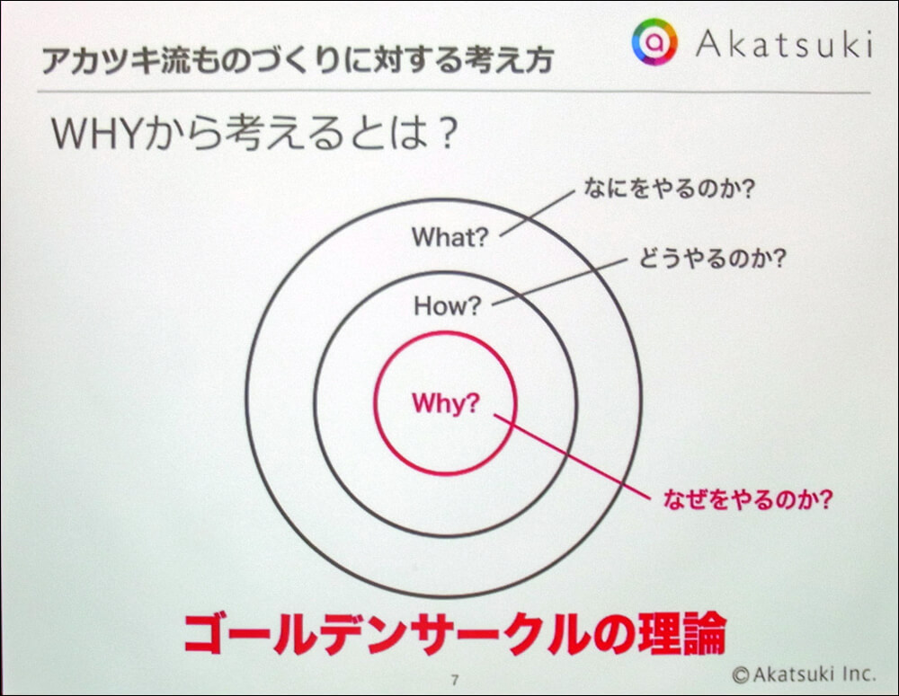 企画を立てる際、一般的には「WHAT(何)」から考えがちだが、アカツキでは「WHY(なぜ)」を中心に考えるという。「なぜつくるのか」を最初に考えることで、「どのようにつくるのか」、「具体的に何をつくるのか」が自然に導き出されるという考え方だ。なお、この考え方は、マーケティングコンサルタントのサイモン・シネック氏が、2009年に『TED TALK』でプレゼンした、「ゴールデンサークル理論」に基づいている。