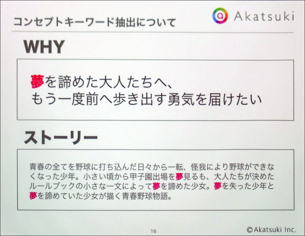 この思いを想定ユーザー(20代後半から30代前半の男女)に届けるためには、どのような方法論が最適か。そこで導き出された答えが「青春×女子高生×高校野球」というキーワードだった。そこから「夢」、「青春」、「日常風景」、「仲間との信頼」、「日々の積み重ね」といったコンセプトワードが抽出されていき、最終的に「怪我で野球ができなくなった男子高校生=プレイヤーと、女性ゆえに甲子園に出場できない女子高生の物語」に結実。具体的な仕様へと固まっていった。