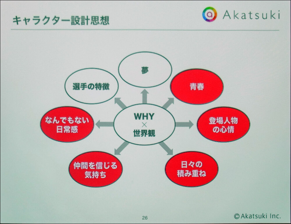 企業理念やクリエイティブの方向性を掲げる企業は多いが、それが実際にどの程度製品と関係しているかについて、明確に説明できるクリエイターは少ない。「史上最高のエンターテインメントをつくる」ことを企業理念に掲げる一方で、現場は力業でクオリティを上げるのみ......。多くの開発現場で見られる光景だが、これでは持続的な成長が望めないのは明らかだ。こうした中、熊谷氏は「アカツキでは『WHYから考えるものづくり』を推進している」と切り出した。
