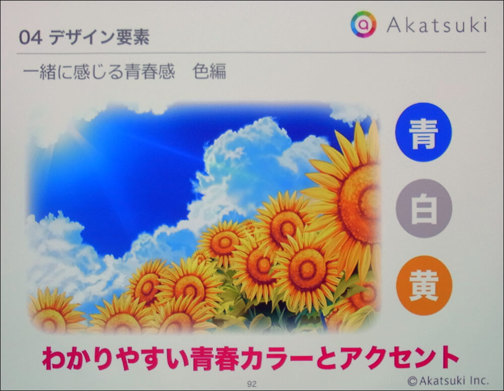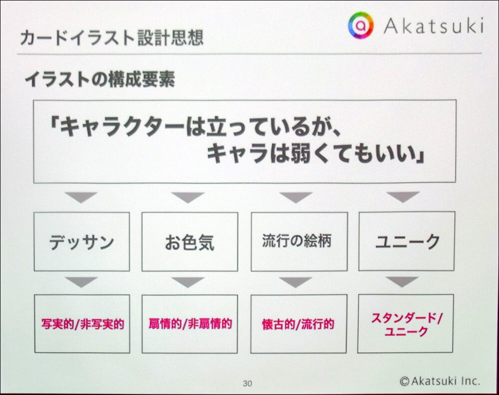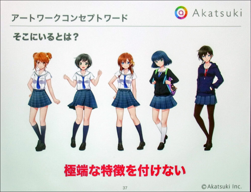 「青春感」が他に比べて細かく規定されているのは、これがカードイラストの量産に影響するからだ。前述のように同作ではカードイラストがストーリーやゲーム全体の体験に大きな影響を及ぼす。カードイラストはゲームに登場するヒロイン一人ひとりに紐付いており、ストーリーを進めるうえでも、ヒロインの魅力を引き立たせる上でも、鍵を握る要素だ。そのため、開発にかかわるスタッフ全員でデザインの方向性を共有しておく必要があるというわけだ。