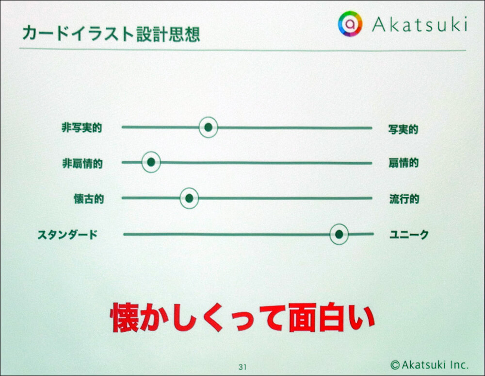 理由として挙げられたのが、冒頭でも説明されたゴールデンサークル理論と、そこから抽出されたコンセプトワードだ。同作では、このコンセプトを表現するために、高い熱量のカードイラストが作成されている。これに対してUIを同様のコンセプトでデザインしてしまうと、内容が食い合ってしまう。カードイラストの良さを活かすためにも、UIは「カードイラストの心情を阻害しないシンプルな内容に留める」とされたのだ。これにはウェブデザインから転職してきた熊谷氏のキャリアに負うところもあるという。