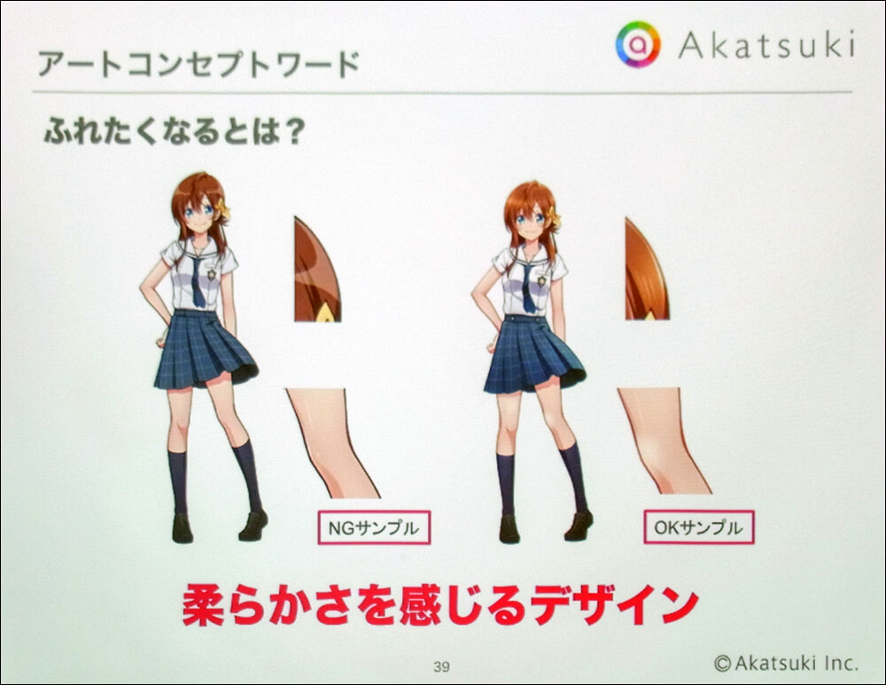 続いて講演は柴田氏による「ビジュアルアートの設計思想」に移った。はじめに柴田氏が説明したのは、「キャラ」と「キャラクター」のちがいについてだ。一般的には同義とされる本概念だが、アカツキでは「キャラはデザインから受ける印象」で、「キャラクターは物語の登場人物」だと区別されている。つまり、各々のキャラクターはゲーム内における世界観やストーリーと密接に関係しており、キャラクターデザインもその影響を受けるというわけだ。