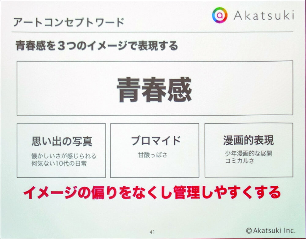 同作のコンセプトを実現する上で重要な要素となるのが「より現実味のある青春物語」だ。これをアートワークで実現するために抽出されたのが「そこにいる」、「ふれたくなる」、「青春感」というキーワード。そこから「キャラクターに極端な特徴をつけない(=キャラは弱くても良い)」、「柔らかさを感じさせるデザイン(=アニメ的な影や直線的なてかりを抑える)」などの方向性が決められた。また「青春感」については「思い出の写真」、「ブロマイド」、「漫画的表現」というイメージで表現されることになった。