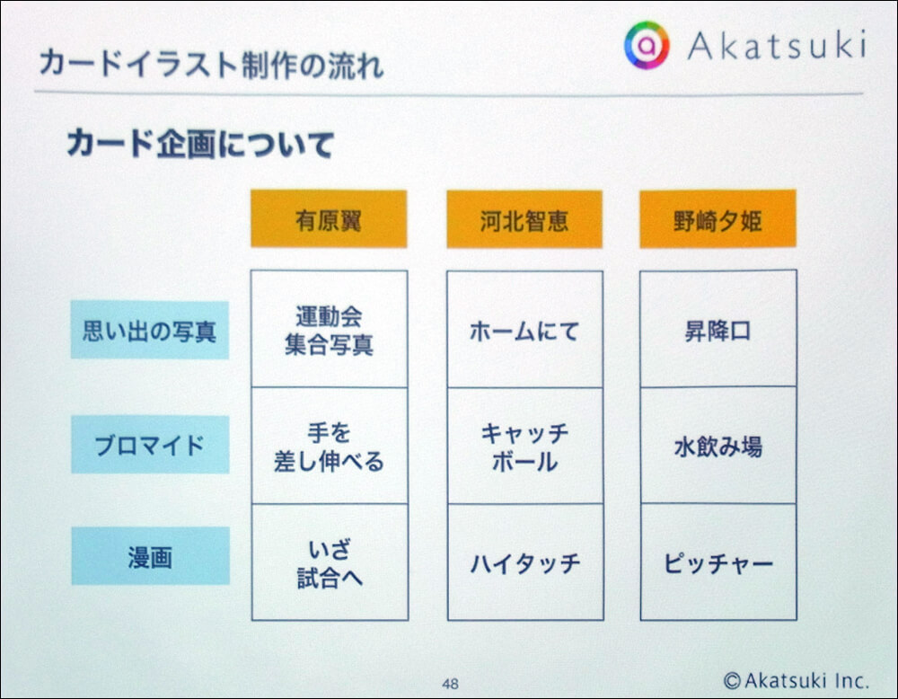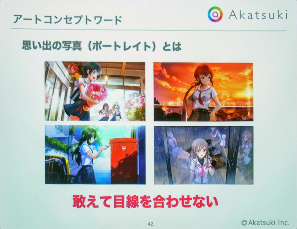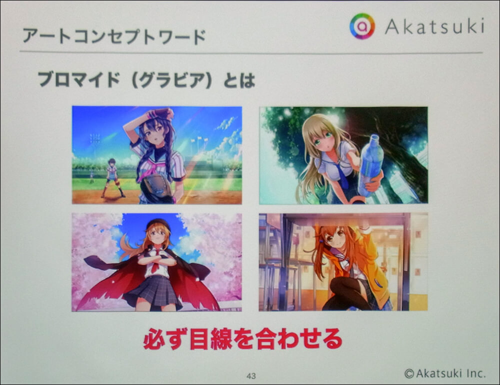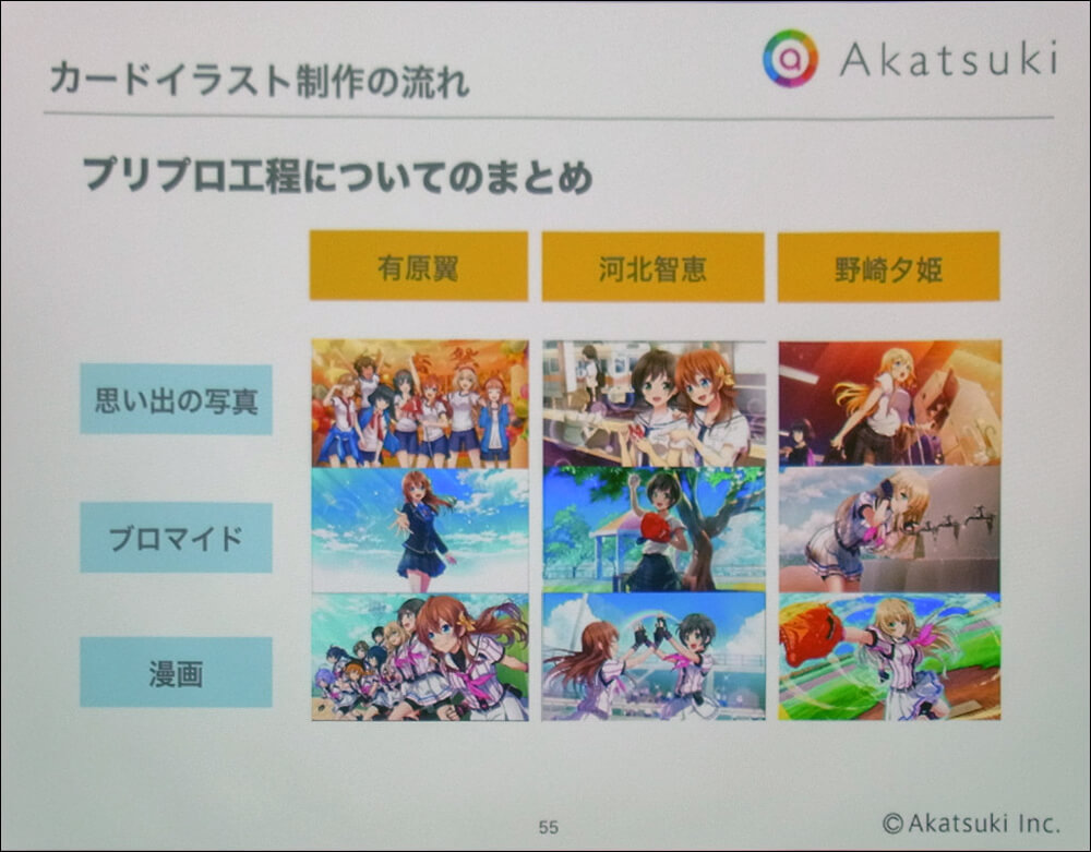 カードイラストにおける「思い出の写真」とは、スナップ写真のようにヒロインたちの日常の何気ない風景を切り取ったもの。「ブロマイド」とはグラビア写真のように、ヒロインたちの魅力を引き立たせるものだ。両者のちがいは画面の向こう側で操作しているプレイヤーと「目を合わせるか否か」にある。これに対して「漫画的表現」とは、少年マンガのような躍動感や、コミカルさを演出する絵柄となる。この3種類を切り分けることで、コンセプトを保ったまま、大量のカードイラストにメリハリをつけることに成功している。