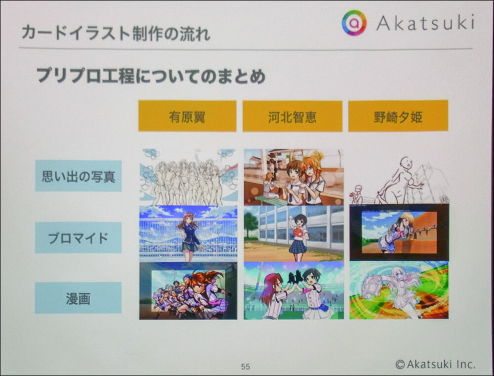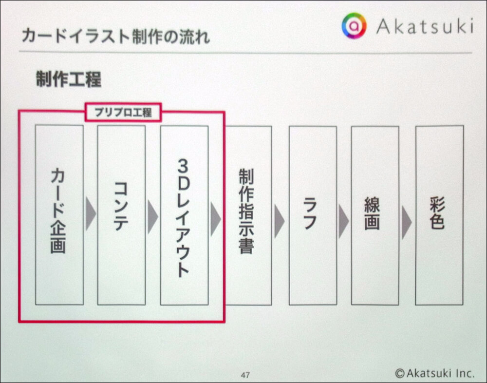 カードイラストの作成ではプロプロ工程が重視されている。以前は制作指示書とラフの間で手戻りが多かったが、プリプロを重視することで手戻りがぐっと減ったという