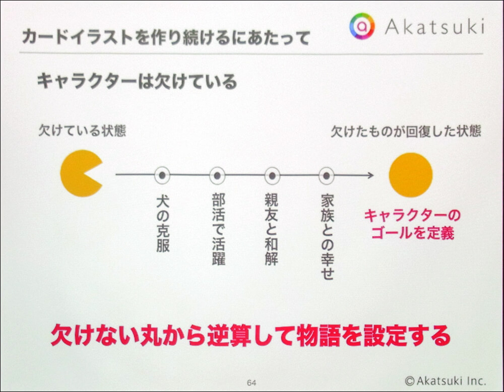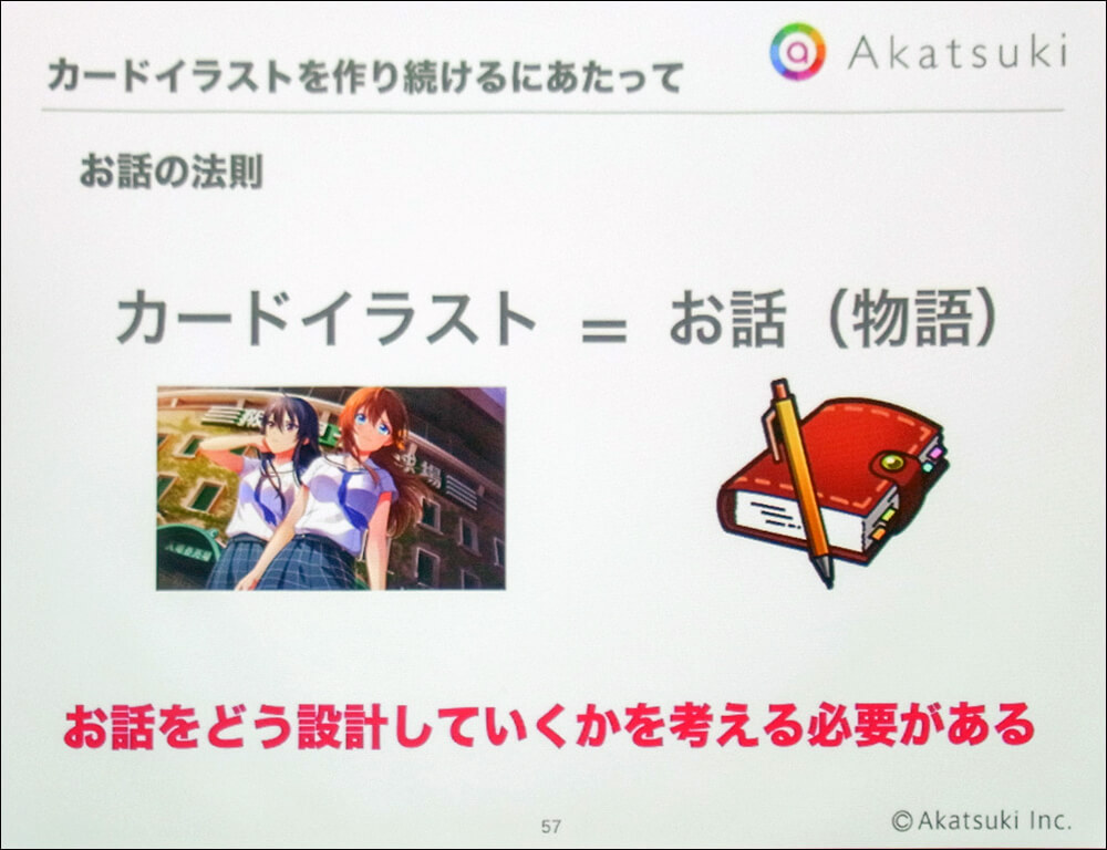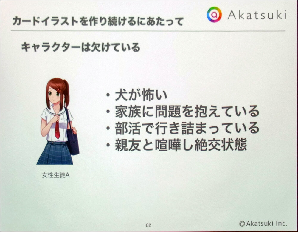 最後に柴田氏はカードイラストとストーリーの関係性について整理した。前述のようにカードイラストはストーリーと不可分の存在であり、カードイラストの企画にはストーリー展開が欠かせない。では、ストーリーとは何か。柴田氏は「キャラクターが抱える精神的な欠損が、自身の行為によって充足されていく過程」という、映画脚本におけるセオリーを紹介した。その上で一人ひとりのヒロインに詳細な設定を行い、複数のエピソードを時間軸に沿って並べることで、その過程を描き出すようにしていると説明された。