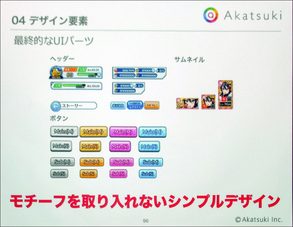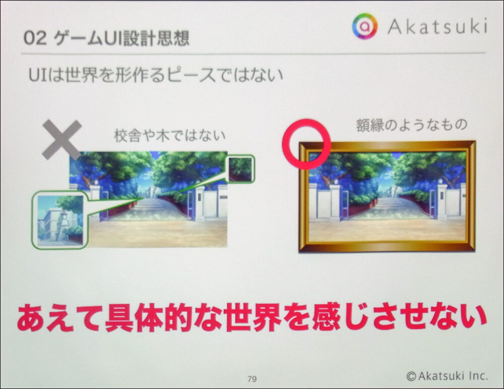 後半パートでは熊谷氏により、ゲームUIの設計思想が説明された。はじめに熊谷氏はゲームUIの役割について「画面上の情報類の配置や動きを設計」、「ゲームのおもしろさを的確に伝える」、「世界観をユーザーに最大限に伝える」ことと整理した上で、「UIは世界を形成するピースではなく、絵画でいえば額縁のようなもの」だと説明。その上で「あえて具体的な世界を感じさせないデザインにした」と説明した。これは上記の内容と、一部矛盾するようにも聞こえる内容となる。