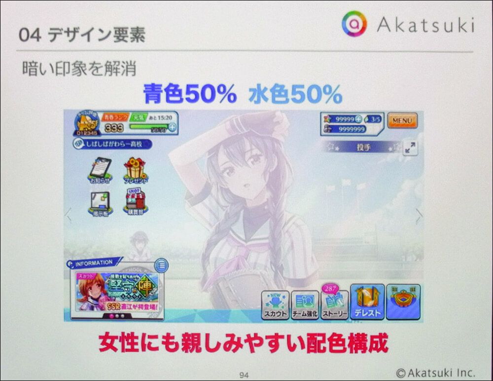 UIは画面上に常時表示されるため、UIデザインはメイン画面の設計に大きな影響を与える。そこで最初にUIのイメージカラーが選定された。コンセプトキーワードである「青春感」から抽出されたのは、青空と入道雲を想起させる「青」と「白」だ。これにアクセントカラーとして、向日葵の黄色が選択された。もっとも、実際に画面をデザインしたところ、濃い青を使うと画面が暗くなってしまうことがわかった。そこで青と水色を半々ずつ使用し、女性にも親しみやすい配色にしたという。