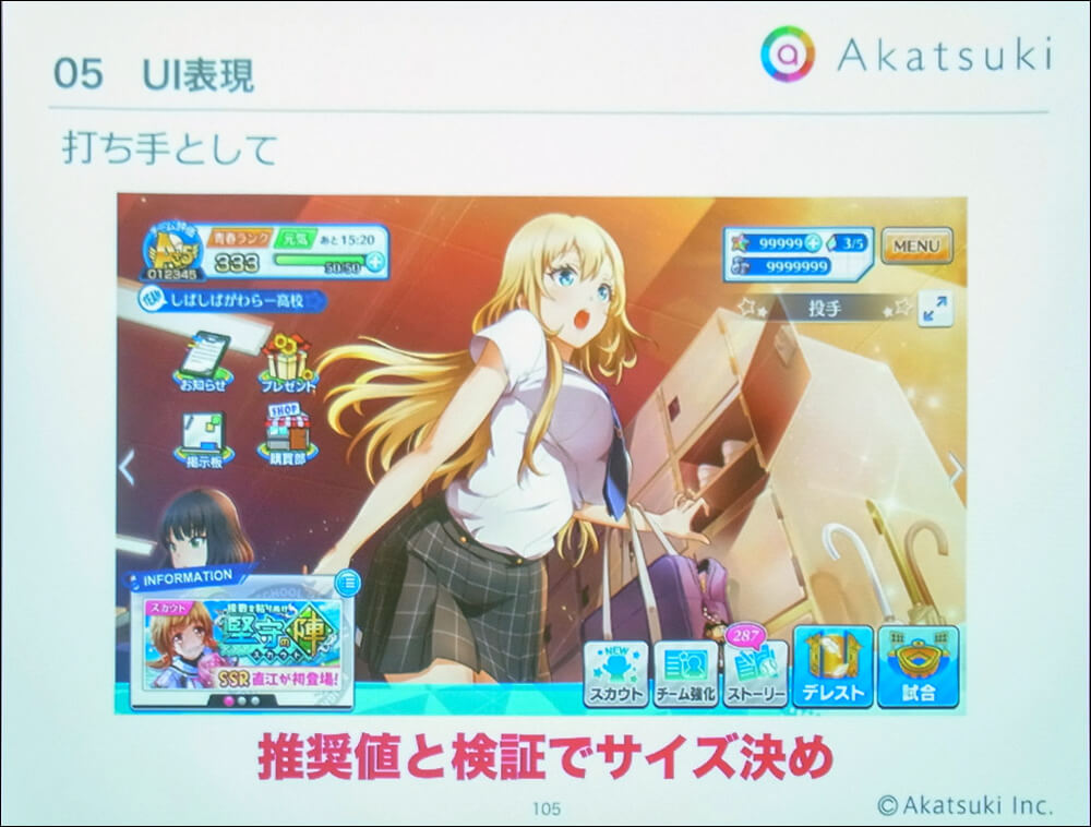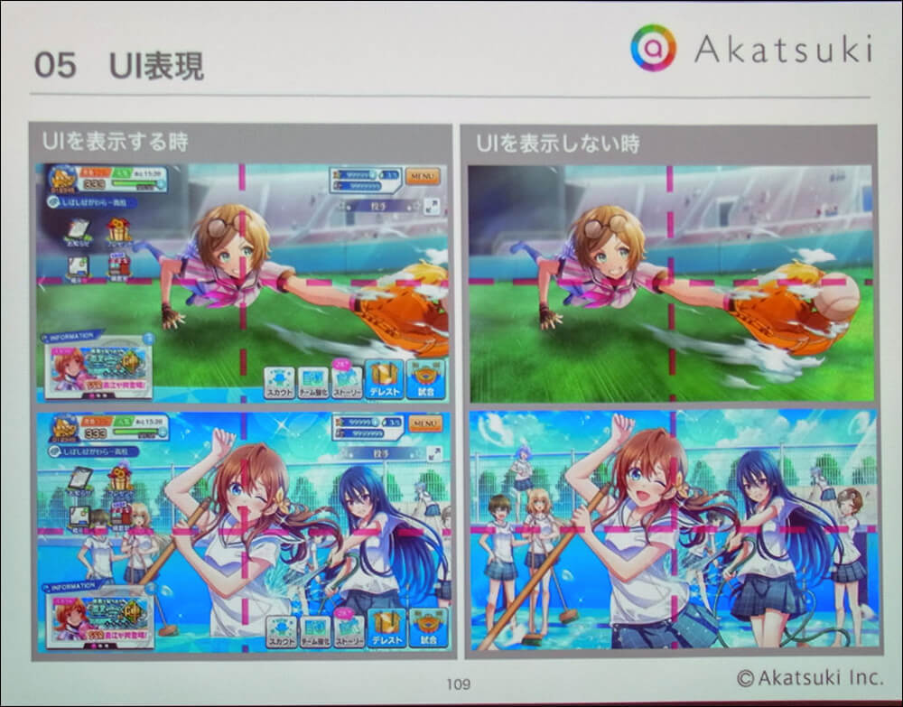 一般的にスマホゲームでは画面の四隅にUIが配置されるため、キャラクターを魅力的に見せようとすると画面中央部に顔を配置せざるを得ないなど、構図が限定されがちになる。そのため同作ではUIの表示有無でカードイラストの中心点を変える工夫が行われている
