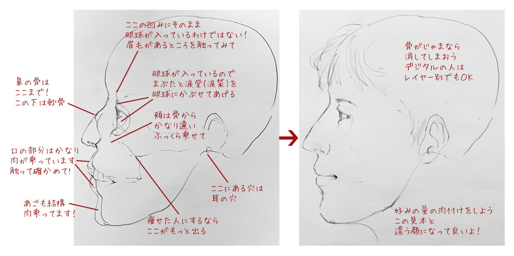 さて次に、先ほどのリアルな頭蓋骨に肉づけをした絵と、自分の絵の中間を描いてみましょう。自分の描きやすい絵に少しだけリアルさを足してみて、さらに足して...と、何段階か描くとわかりやすいと思います。
