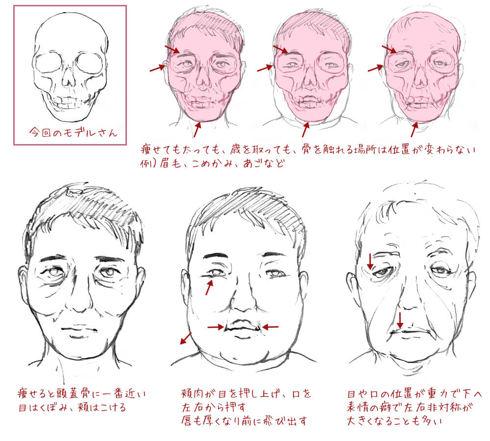 頭蓋骨にうっすら肉をつけたものを描くと、かなり痩せた人物が描けます。太っている場合は骨に触れるところには肉はつけず、それ以外に肉をつけると正確に太らせることができます。