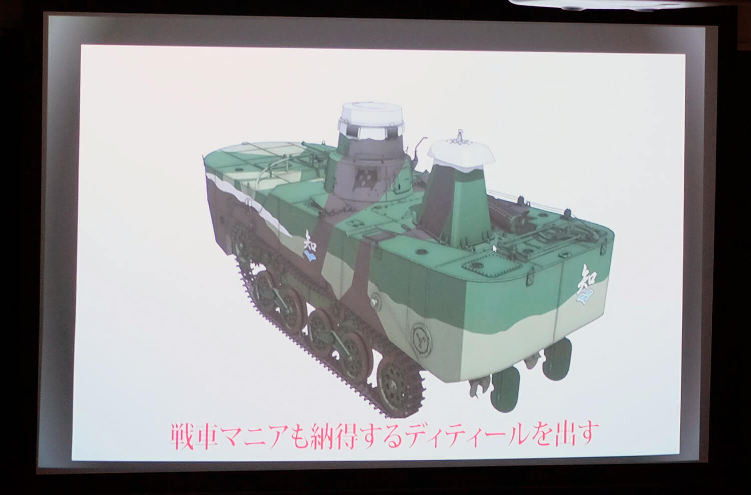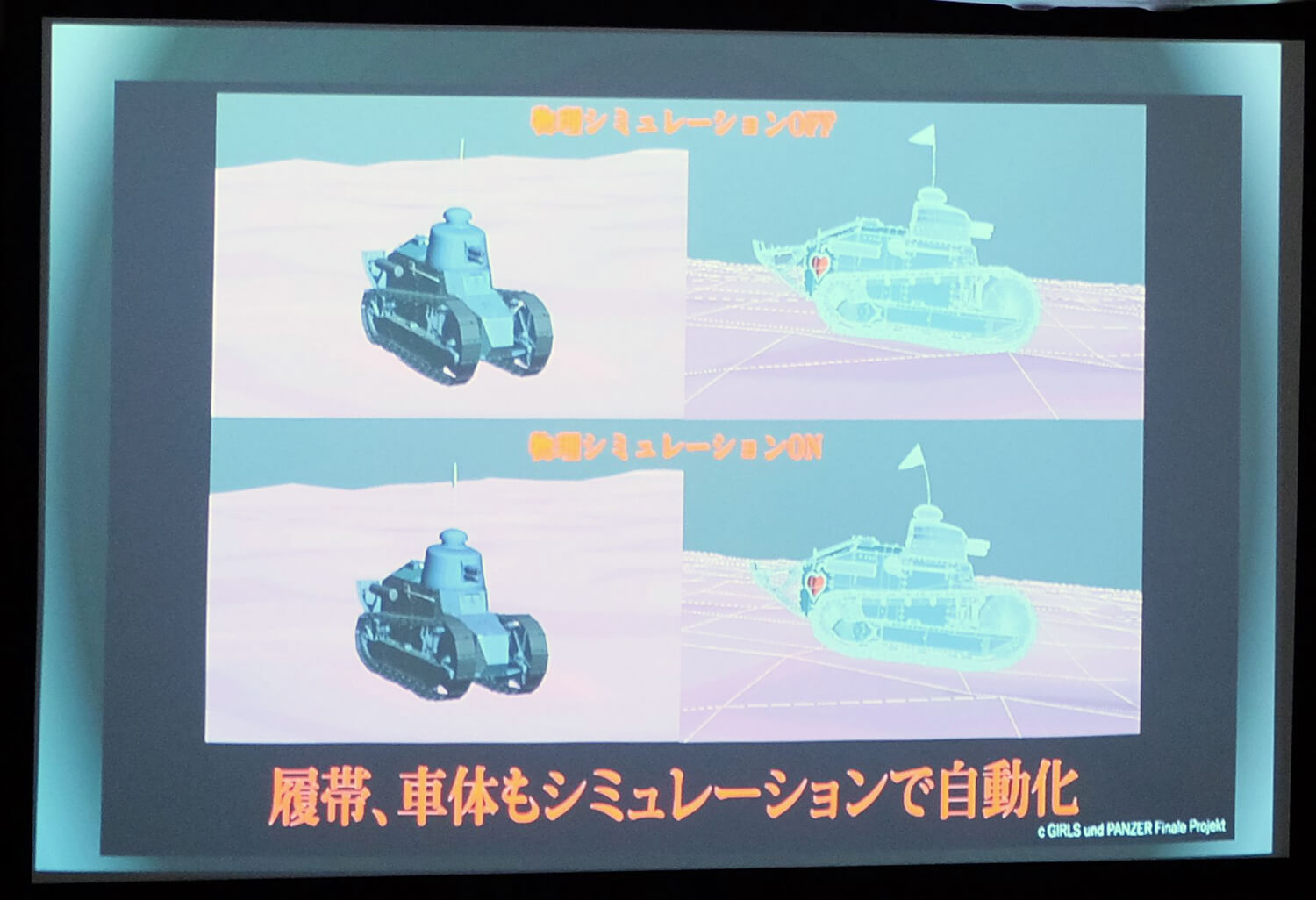 柳野氏は作画にはない3DCGの優位性は「アセット」だとコメント。アセットは一般的には素材データのことを指すが、「『ガールズ&パンツァー』のアセットは少し異なる」と口にした。戦車マニアも納得できるように軍事監修チェックでディティールの精度を上げることはもちろん、戦車のリグは半自動にしてボタンを押すだけで地面に接地するようにしており、車体の傾きやサスペンションも自動化した。