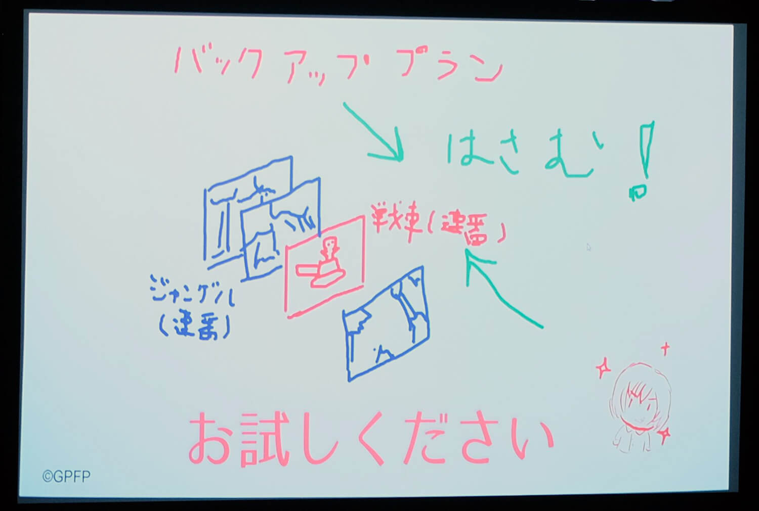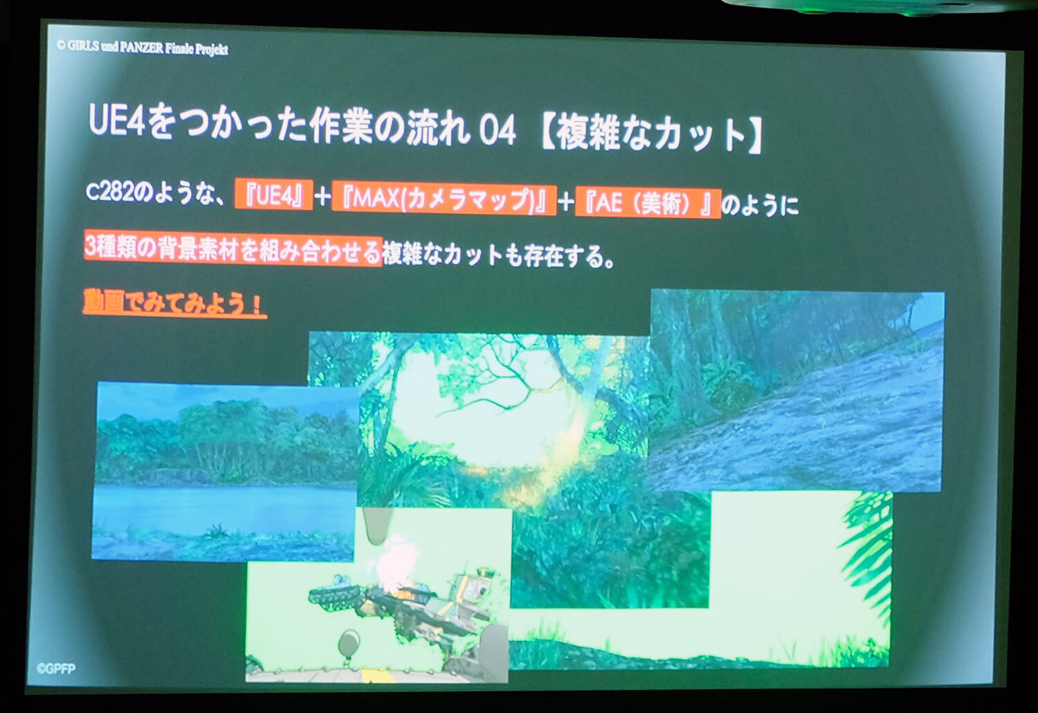 その後再登壇した柳野氏は、開発が間に合わなかった場合のバックアッププランとして、UE4から連番出力した背景を使って戦車を挟み込むという手法を用意していたことを語る。このバックアッププランを大量に用いるために、絵コンテを「斜めフォロー」、「前後フォロー」、「横フォロー(寄り)」、「横フォロー(引き、地面あり)」の4パターンに類型化した。連番をバンク化したことによって、UE4のカットを倍増させたと制作秘話を打ち明けた。