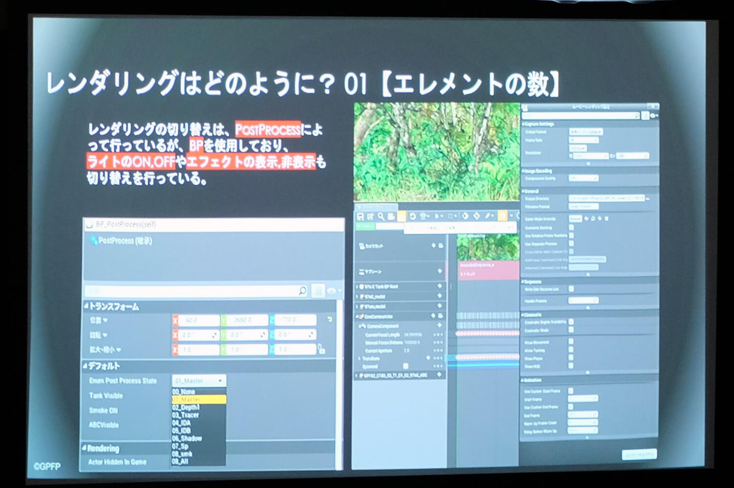 後半はグラフィニカ 京都スタジオ代表の小宮彬広氏が登壇。実際に作業風景を見せながら、映像ができるまでを紹介した。「最終章 第2話」では、既存の戦車やキャラクターは3ds Maxでレンダリングして、背景だけUE4を使うことになったが、ジャングルという舞台のために草木がカット内の戦車やキャラに絡みすぎるという問題が生じた。そのためマスク用として、UE4に戦車とキャラを取り込むことになった。