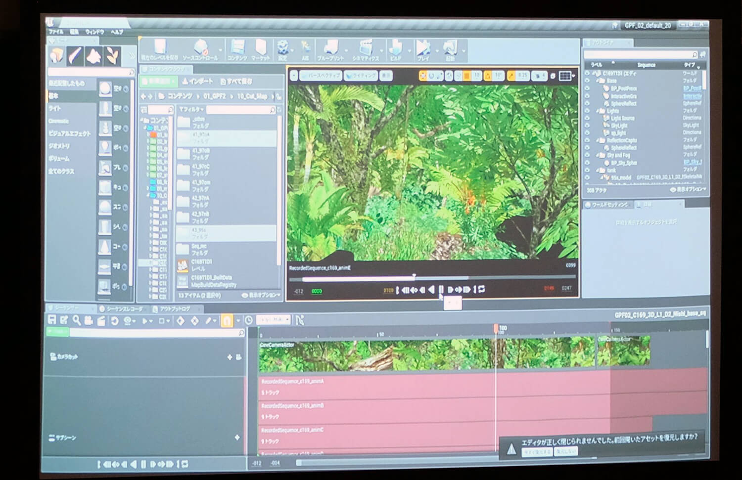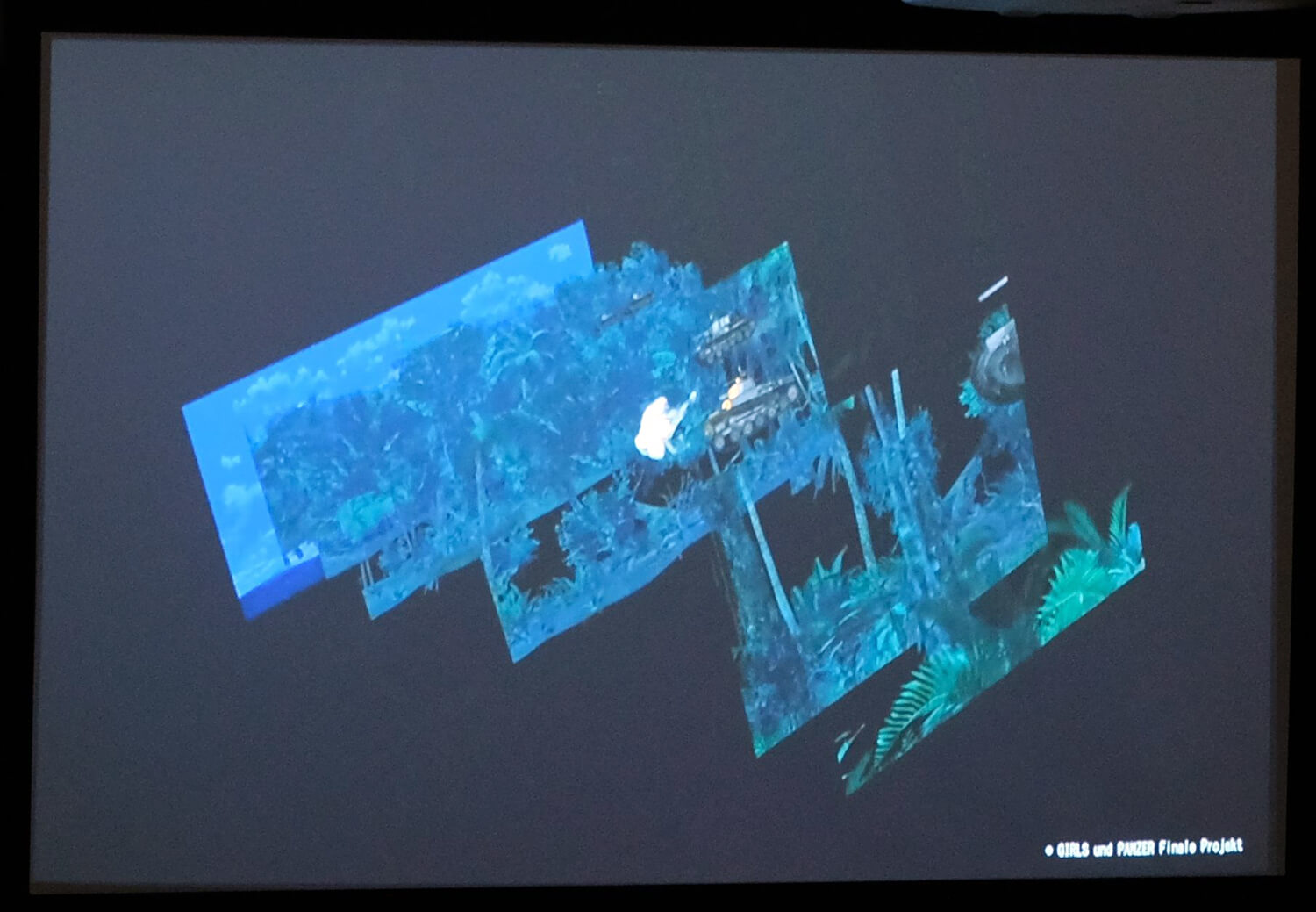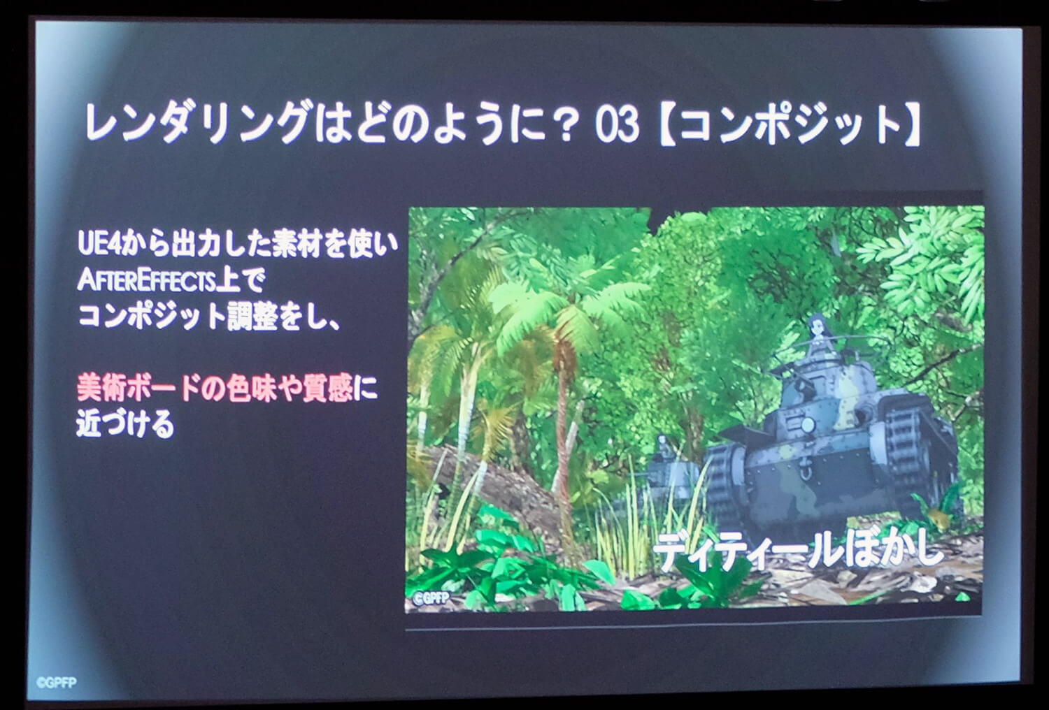 だが柳野氏はそういった準備をしても理想にはほど遠かったと述懐し、具体例としてジャングル戦に触れた。『ガールズ&パンツァー』は背景動画フル3Dの主観視点が多い作品のために3D作業負荷が高く、自然物が多いジャングル戦は「最も地獄」だったそうだ。しかし水島努監督の「2話はジャングル戦がやりたい」という鶴の一声によって、TVシリーズやOVA、劇場版で困難を極めた森の表現に今度は真っ正面から向き合うことになってしまった。