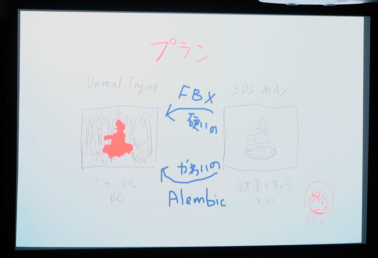 まずは開始早々、プロジェクタに「安易にゲームエンジンを使うのは危険!」という文字が映し出され、客席の笑いを誘った。柳野氏は「UE4やUnityなどのゲームエンジンを使えば、楽にアニメができるのではないか?」という軽い考えでは、ろくなことが起きないと断言。理由として、開発のための人手が必要で実装するまでに予算がかかること、苦労してつくり上げた割にはゲームのような映像になってしまうことを挙げた。そのような失敗をしないためには「目的と手段を明確にすること」が重要だと語る。