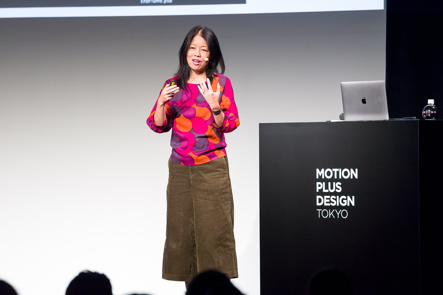 「こんにちはー!」というカリン・フォング氏(以下、フォング氏)の明るい声と笑顔で「Motion Plus Design TOKYO 2019」ゲスト・スピーカーの幕は開いた。フォング氏のスピーチでは、自身で用意した質問に自身で答えるという形式で彼女のクリエイティブやデザインに対する考え方が紹介された。