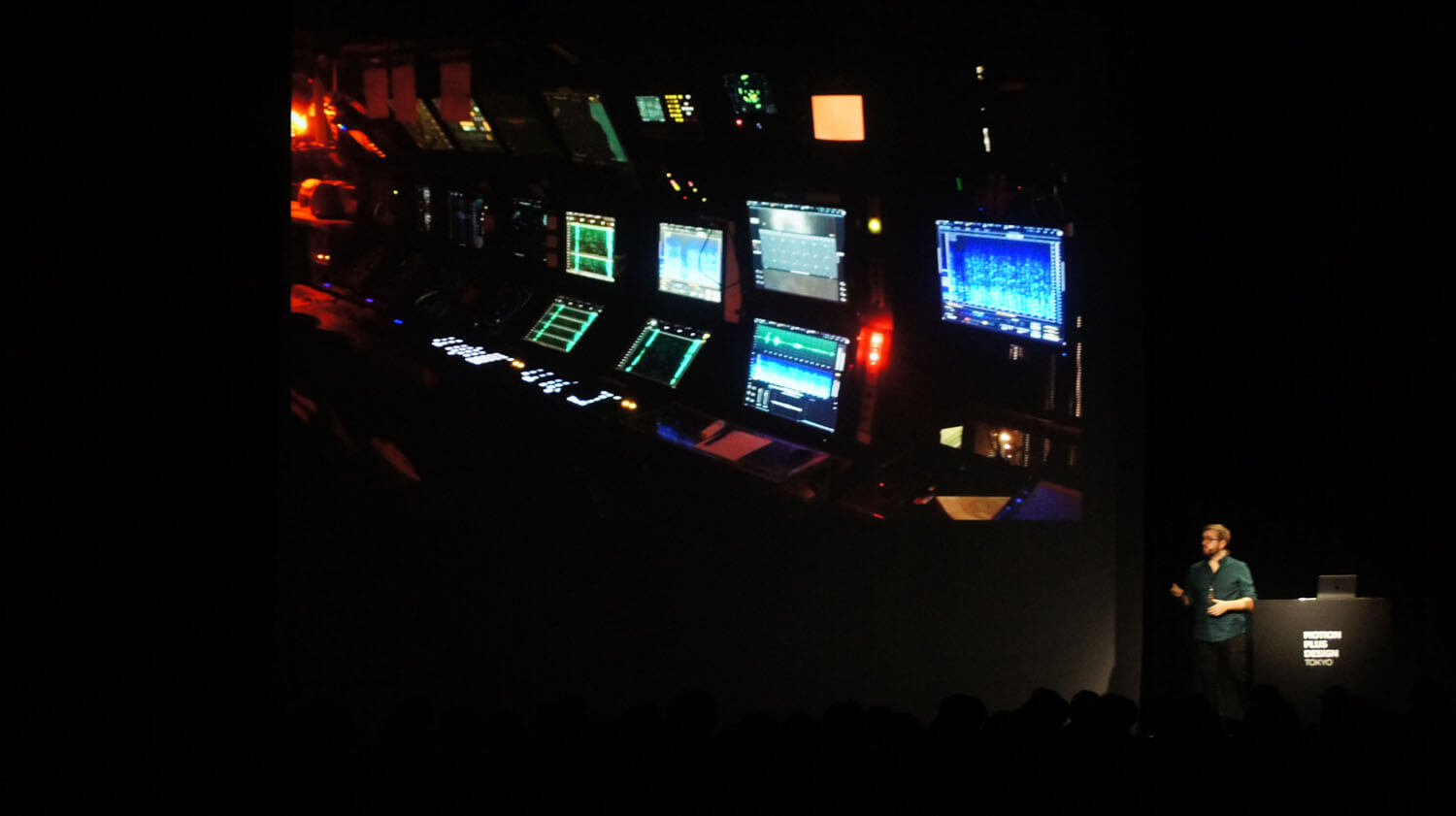 サム・キーハン(以下、キーハン氏)は「1人で篭ってちゃダメ! 仕事はコラボレーションなんだから」と語った上で、自身の仕事のプロセスについてはじめた。彼のデザイン作業は主にモニタディスプレイとその空間配置だ。「本物らしさが重要なんだ。それを求めないと作業はこんな状態からはじまるよ」と言って作業しているデスク風景の写真を見せた。作業者の前のモニタが全面グリーンだ。セットを全て1人でCGでつくり上げていくという比喩だが、これは現実に起こりうる話である。「コンセプトアートを基にシーンをつくり上げていくんだけど、本物らしさがとても重要で、そのためには膨大なリサーチを行うんだ」と、実例が紹介された。
