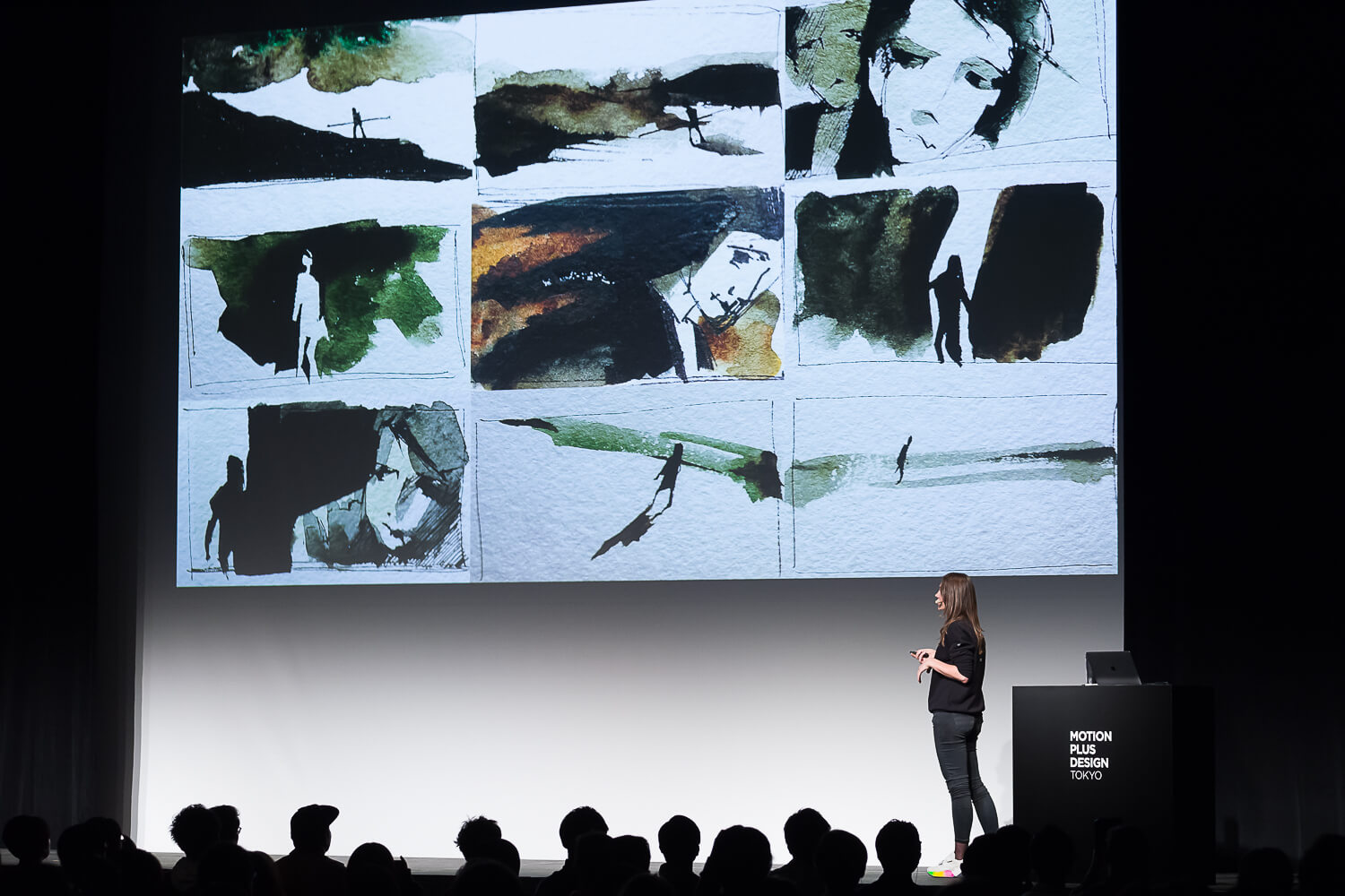 クリエイティブの制作方法については、デジタルとアナログとのミックスを好むといい、具体例としてインクのシミをスキャンしてCGと組み合わせた作品が上映された。単に素材としてアナログ画を合成しているわけではなく、彼女のイメージする世界観に必要な材料として溶け込ませているため、スキャンした画像を最初に見ていなければそこにアナログなインクのシミが使われているとは気づかないかもしれない。