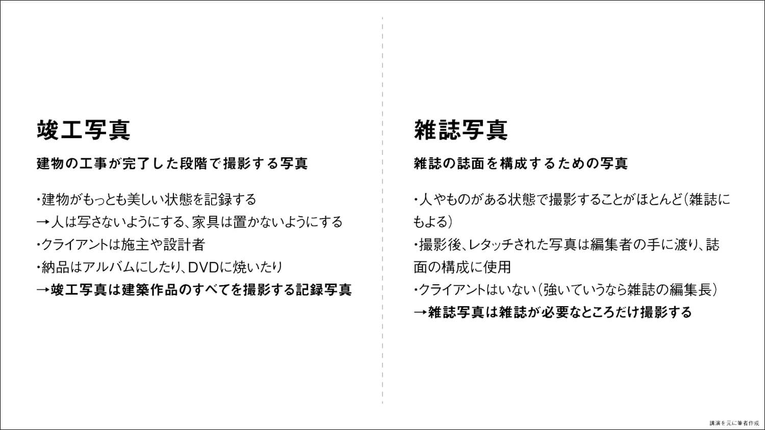 まずY氏は「竣工写真」と「雑誌写真」のちがいについて下図のように説明した。