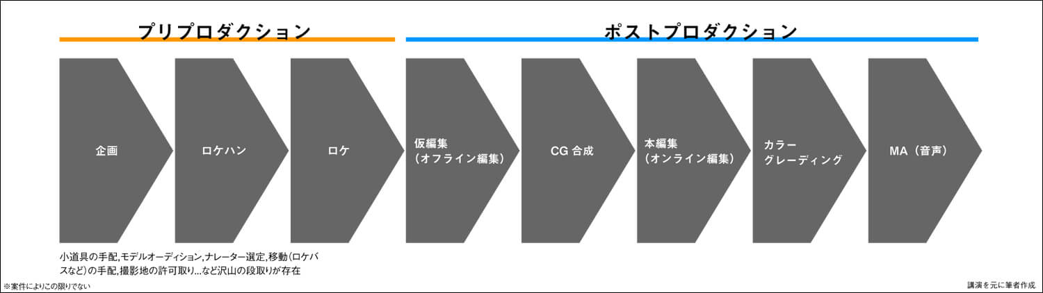 特にこの中で重要なのは「プリプロダクション」だと語る。企画準備段階で行うプリプロダクションは絵コンテの制作、スタッフやキャスト選定、予算確認、スケジュール確認など多岐に渡るが、よい広告CMができるかどうかはこの工程にかかっていると説明する。
