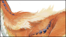 ▲【左】オサイズチのデザイン画の一部。首から背中にかけてグラデーションが入っており、毛の先端が白く描かれている/【右】セカンダリUVを使用したテクスチャ。通常ではUV情報が同じ大量の短冊ポリゴンに対して同一のテクスチャを参照することが多いため、デザイン画のようなグラデーションや模様を再現するのは困難となる。今回は2種類のテクスチャの色をブレンドすることにより、色味の幅をもたせた