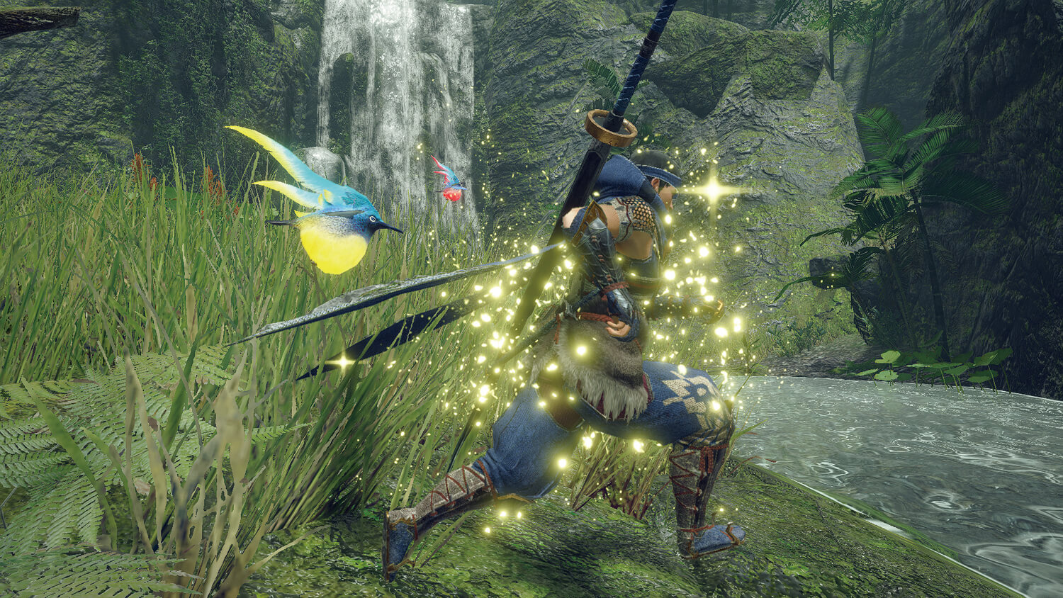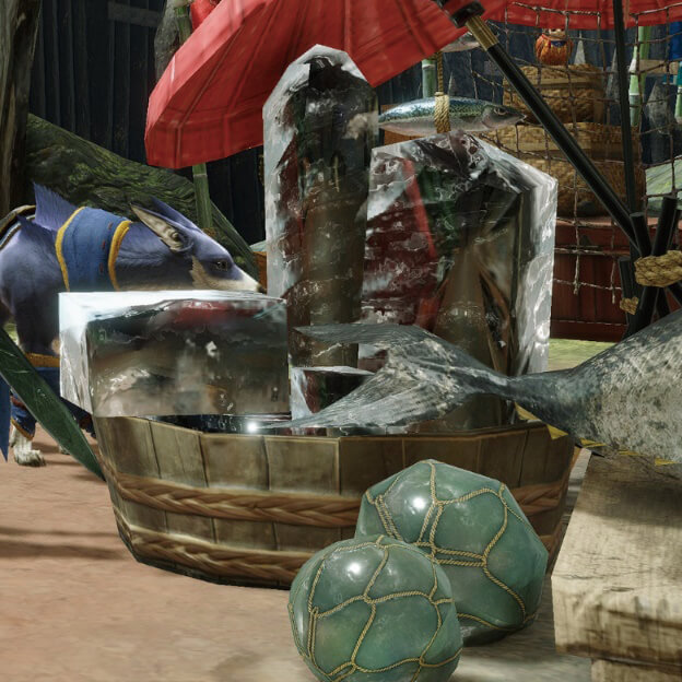 実装面ではパフォーマンスを優先しながらも、画づくりでは表現の幅を広げている。『MH:W』で用いられていたFurブラーや油膜、濡れ、環境マップを利用した屈折表現など、使用頻度が高く処理負荷の低い疑似SSSは本作でも使用され、さらに水面の反射や歪みを表現する独自のプロセスや大気散乱表現を新たに実装。ステージの時間経過に応じた自然な光や、シーンに応じて表情を変える水面を表現できている。