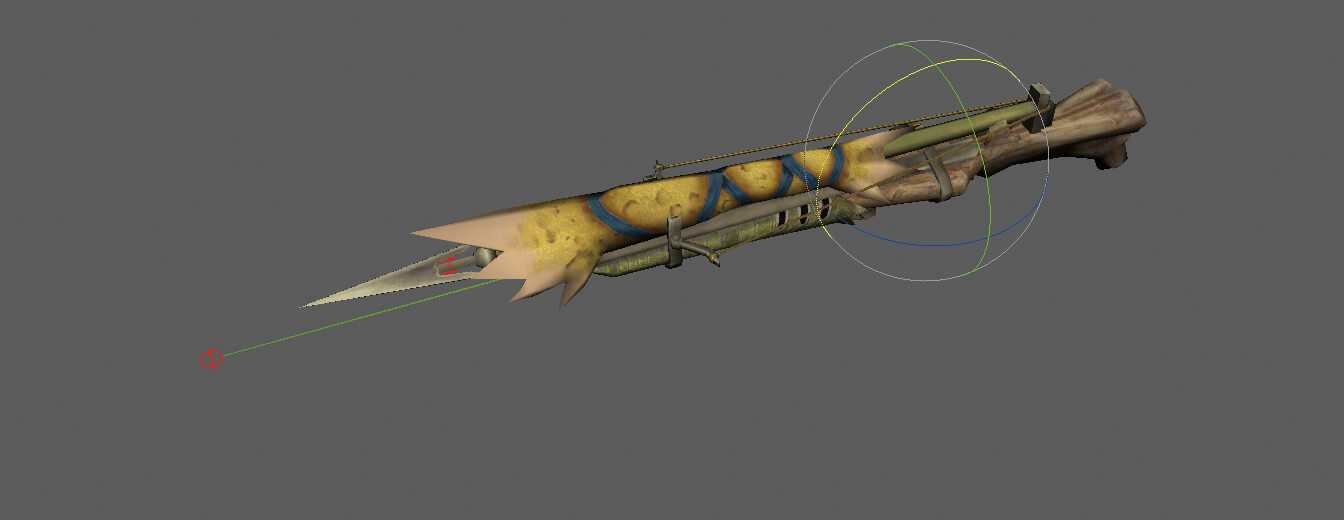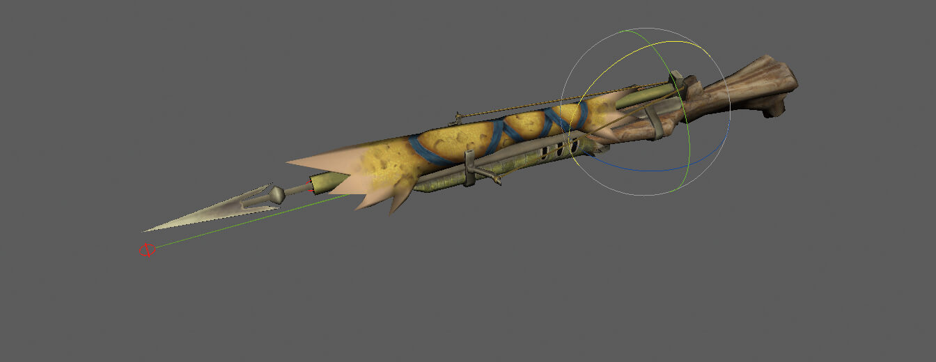 武器はモデルスぺック制限が最も厳しく、実質1,800ポリゴン程度。同じ武器種の変形は基本的に同一のモーションで動いているため、ドリブンキーやパーツの表示切替を行なって変形のバリエーションを増やした。ただし、表示タイミングのフレーム指定などが必要となり、簡単ではなかったという。