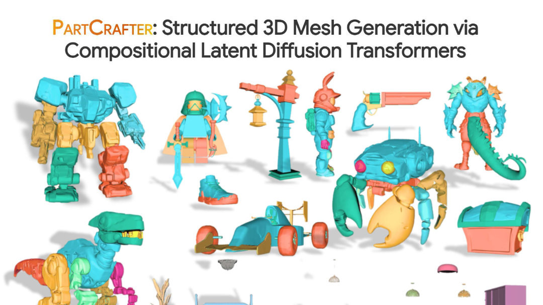 北京大学、バイトダンス、カーネギー・メロン大学からなる研究チームが、パーツ単位で3Dメッシュを生成するAIモデル「PartCrafter: Structured 3D Mesh Generation via Compositional Latent Diffusion Transformers」をオープンソース(MITライセンス)で公開(コードとチェックポイントの公開は7/15を予定)。