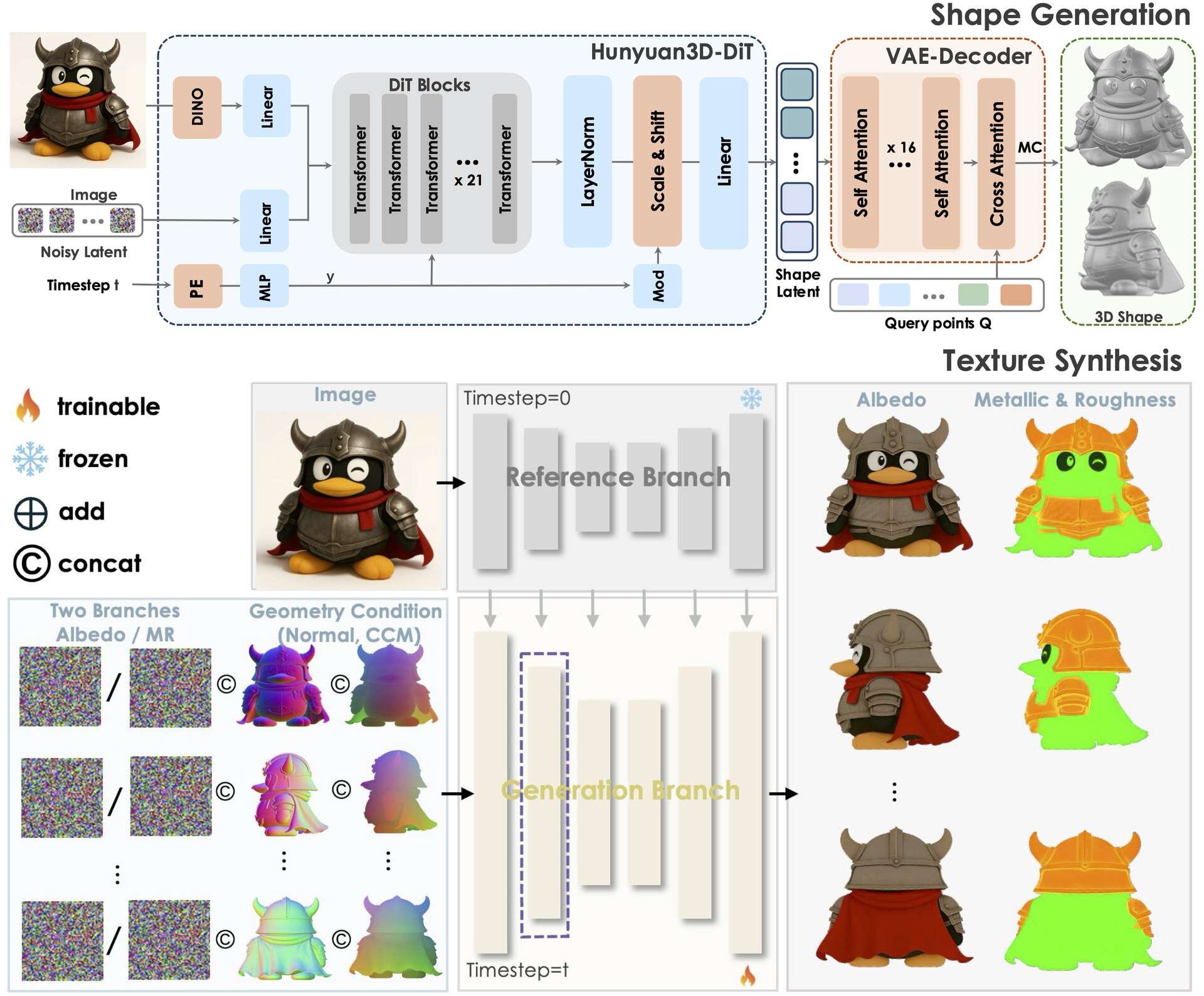 中国テンセント(Tencent)社は6月14日(土)、オープンソースの3Dモデル生成AI「Hunyuan 3D 2.1」をGitHubで公開し、HuggingFaceにデモスペースをオープンした。4月に先行リリースされた「Hunyuan 3D 2.5」が100億パラメータ、8~20秒の高速生成、APIアクセスを基本とした商用製品、後発の2.1は生成速度こそ2.5に劣るものの、完全なオープンソースモデルとして、モデルウェイトとトレーニングコードを提供する、コミュニティ向け基盤モデルであると推定される。