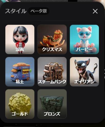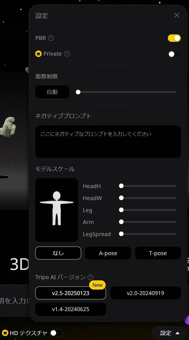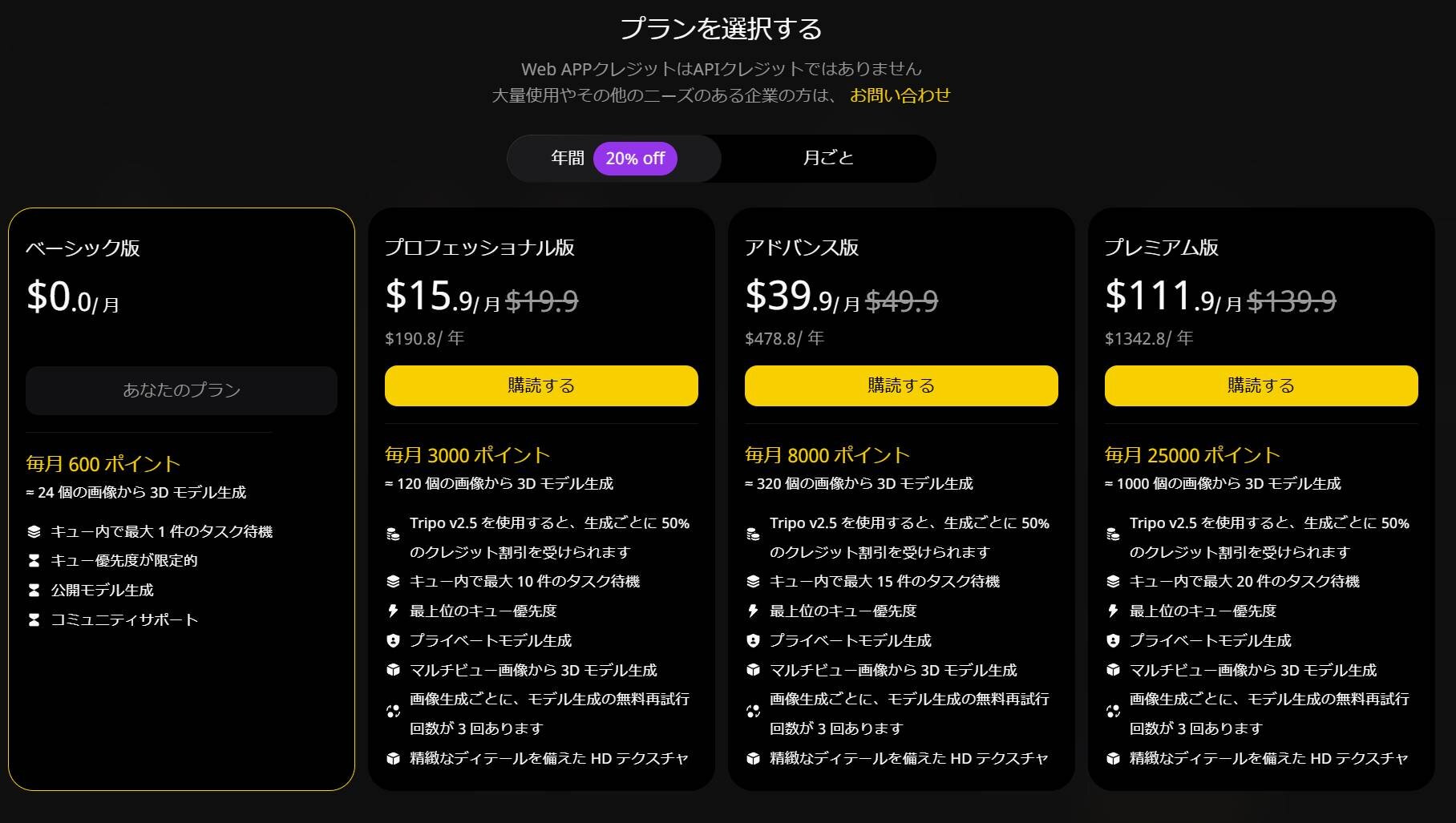 プロフェッショナル版以上の有料プランでは、生成キューの優先、プライベート(非公開)モデルの生成、HDテクスチャの生成が行える。