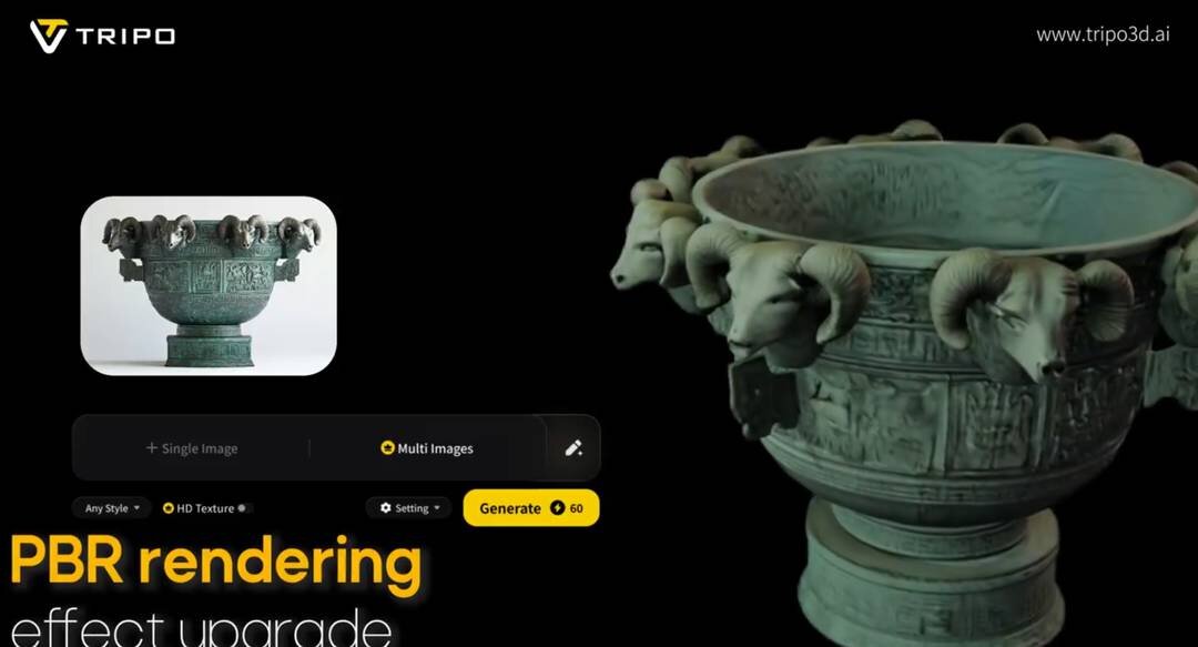 Tripo 2.5は「より正確なジオメトリを生成」、「ブロンズ・ゴールドの新スタイルエフェクト」、「よりリアルなビジュアルを生み出すPBRエフェクトの強化」という3点の新機能と特徴を実装している。