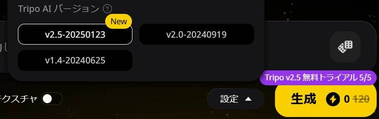 なお、Tripo 2.5での生成には通常120クレジットが必要となるが、現在5回まで無料トライアルが可能となっている。