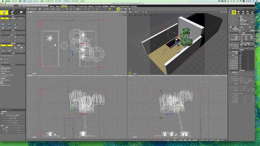 「2Dで色々とトーンを考えてIllustratorでデザインしていくより、リアリスティックなオブジェクトをShadeでつくって統一してしまったほうが、逆に時間がかからない。あとはシンプルに、シンメトリー的に美しく、全体のバランス感を大事に整えていく、という感じで」。