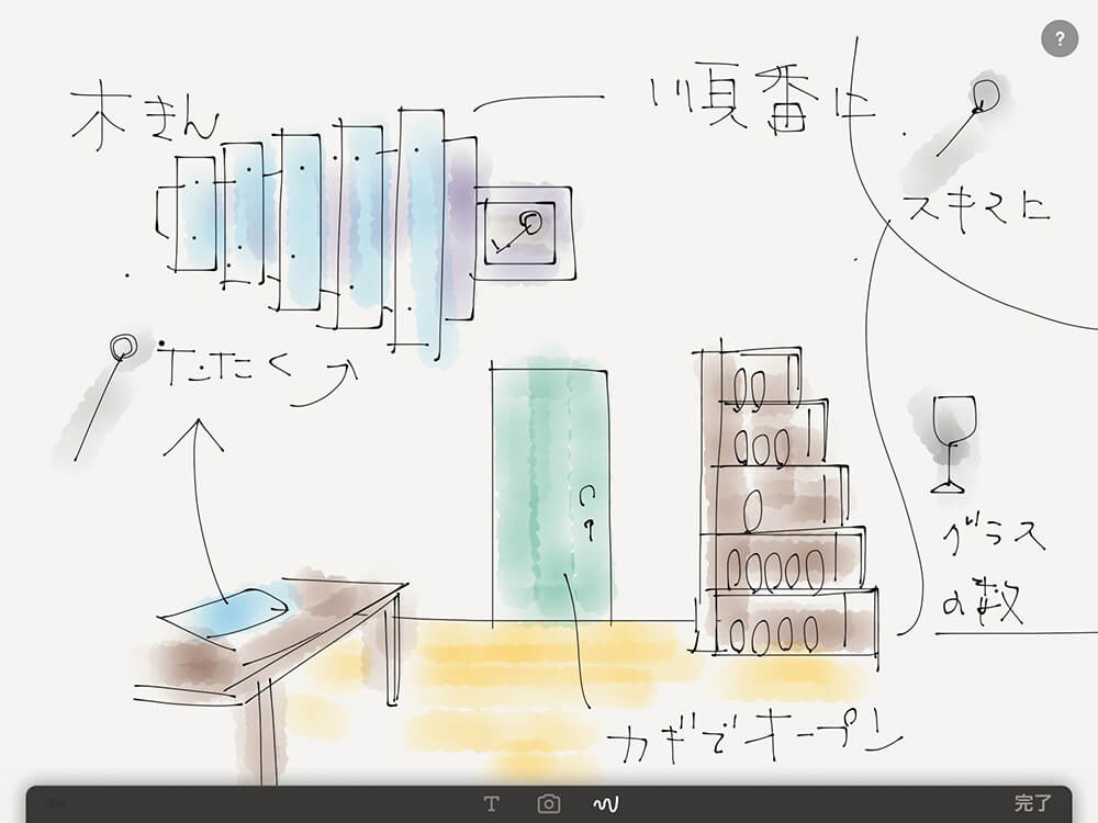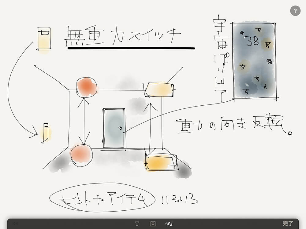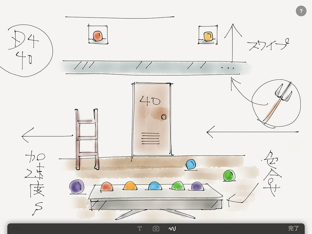 「謎解きの企画は常に何か考えている感じで。思いついたらその辺にあるものに書き留める。最近はiPadのペイント/ドローアプリでメモしていることが多いですね。まず仕掛けありきなので、それを頭の中でつくっちゃわないと、画面構成の開発にも向かえないんですよ」。