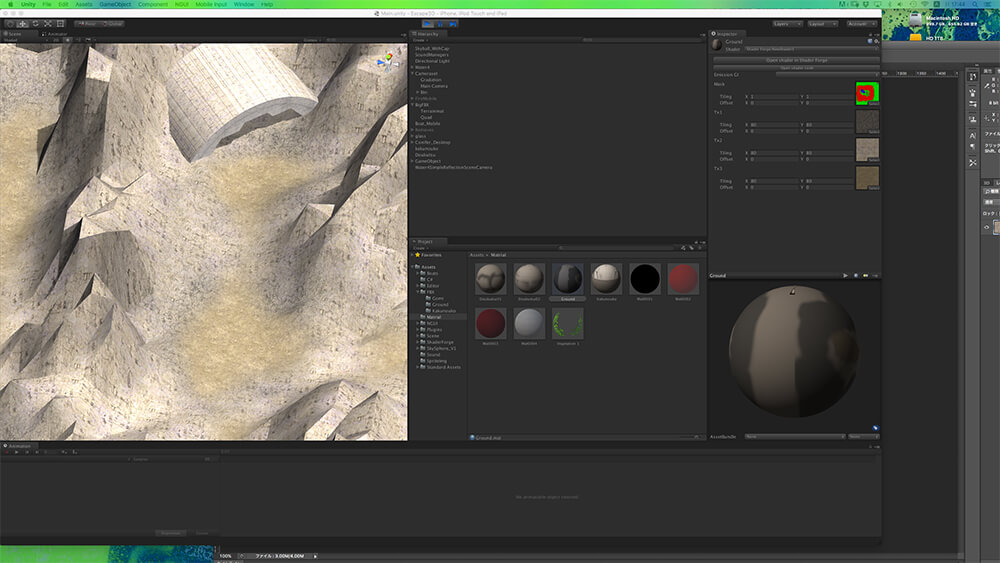 ただ、標準機能で事足りることが多いとはいえ、そこはもちろんデザイナー出身、ビジュアルへの追求を怠っているわけではない。Unityも使い慣れてきたため、いま開発しているゲームでは、さらにさまざまなリアルタイム表現の工夫もし始めている、と野々山氏。常に手軽で良い効果の出るアセットはないかというのはチェックしていて、最近では頂点シェーダを用いて異なるマテリアルをブレンドできる「Shader Forge」がお気に入りとのこと。